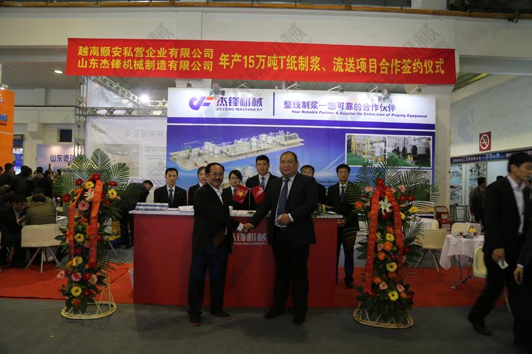 2014‘山东(国际)制浆造纸技术及装备展览会在济南召开,我公司应邀参会,同时与越南顺安私营企业年产15万吨T纸制浆、流送项目合作签约仪式也同时举行。参加展会的有业界领导、同行业公司以及业务关联客户,整个展会是一个展示产品的时机,也是相互切磋的机会,大家相互探讨,共同努力,共同进步,来共同达到国内造纸装备业的顶峰。