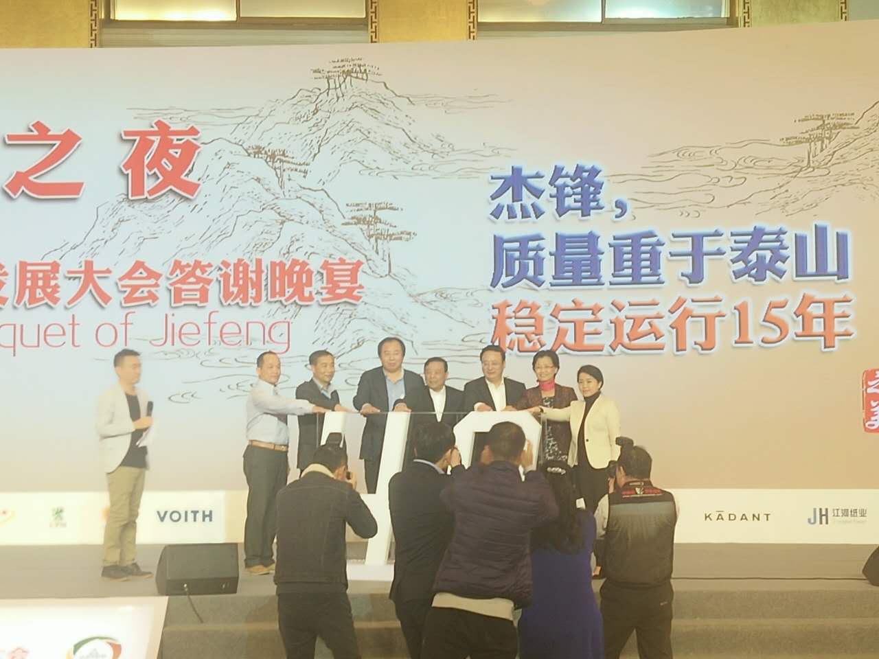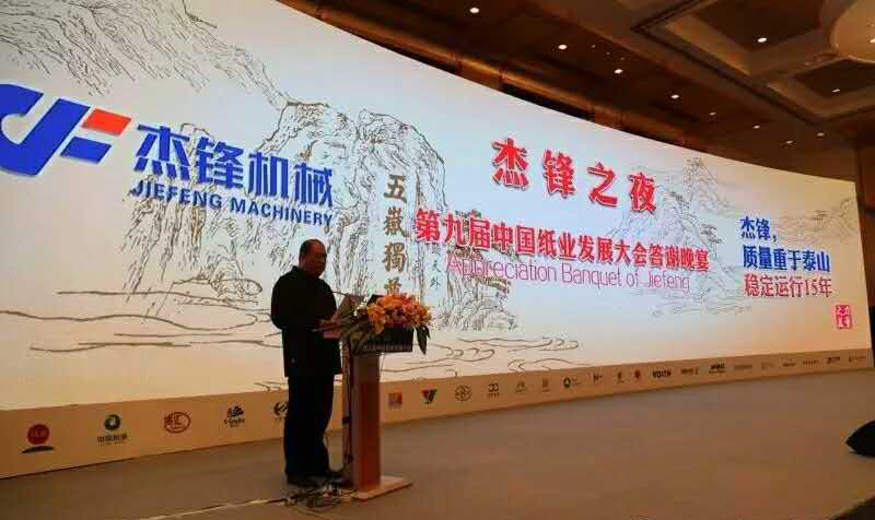 “山东杰锋机械制造有限公司很荣幸承办第九届中国纸业发展大会答谢晚宴--“杰锋之夜”。祝贺纸业商会十周年生日快乐,杰锋机械跟随纸业商会的步伐,渐渐成长为国内造纸装备的领军企业”。 山东杰锋机械制造有限公司总经理张吉祥先生在答谢晚宴上致辞。
